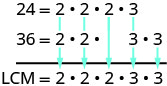 59. 8, 12 60. 4, 3 61. 12, 16 62. 30, 40 63. 20, 30 64. 44, 55 In the following exercises, find the least common multiple of each pair of numbers using the prime factors method.